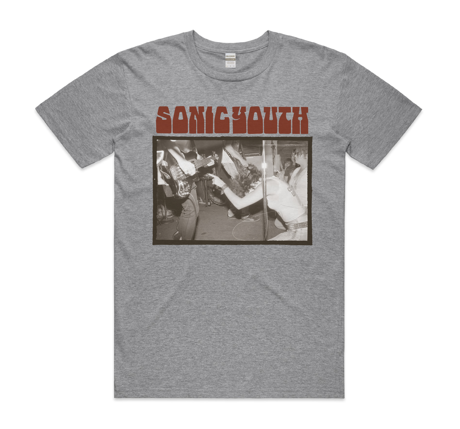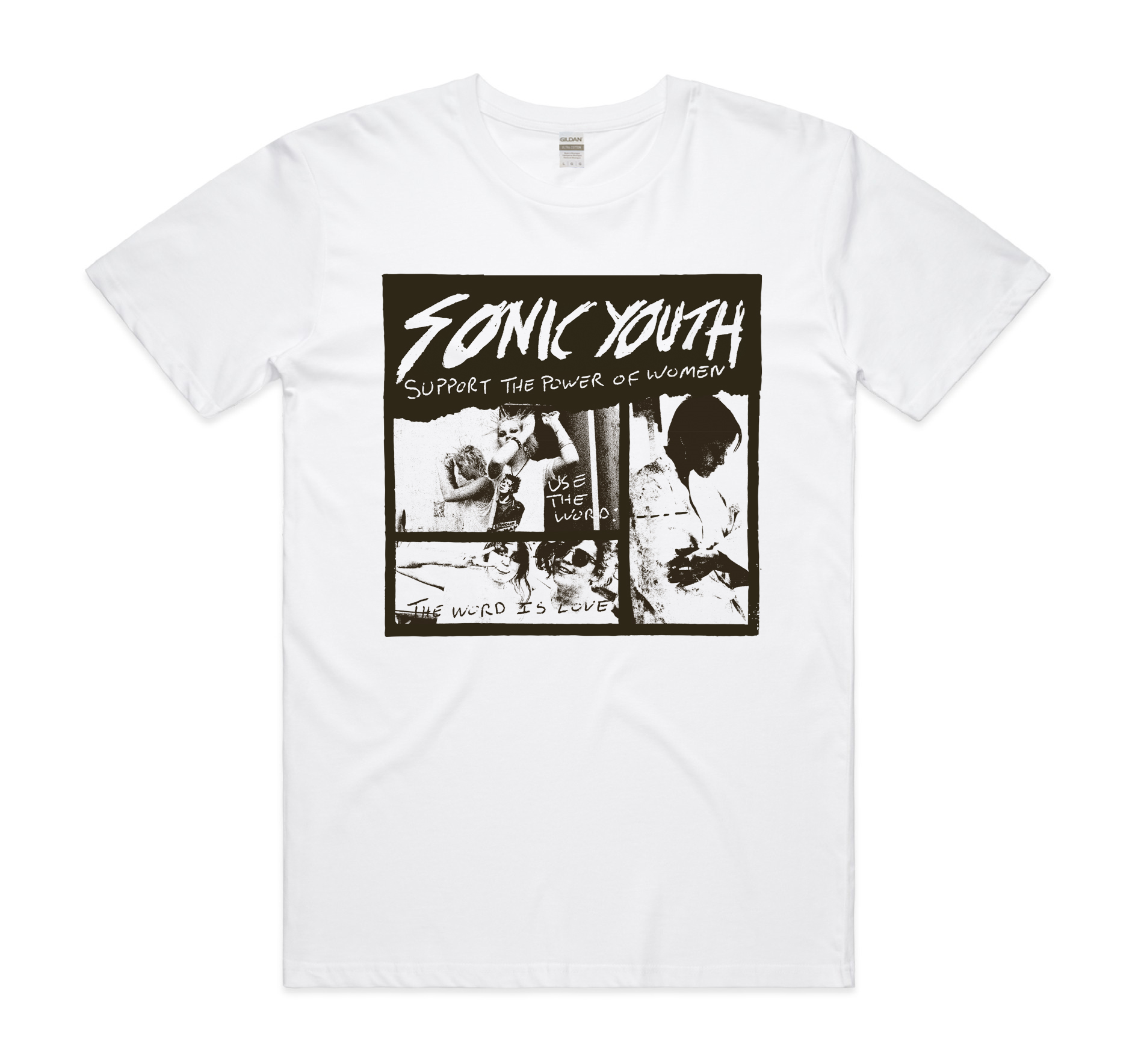 Three new Sonic Youth t-shirt designs are available: two from Texan photographer/friend of the band/author of the recent ‘Texas Is the Reason’ book Pat Blashill, and a third tee featuring a variation of Richard Prince’s “Dude Ranch Nurse” artwork. The first Blashill tee features a photo from their Austin/Continental Club ’85 gig, the second features pro-femme lyrics from their song “Flower” coupled with various photos of assorted women from the 80’s Texan punk scene. Proceeds of both of these will also benefit ASN and Fund Texas Choice.